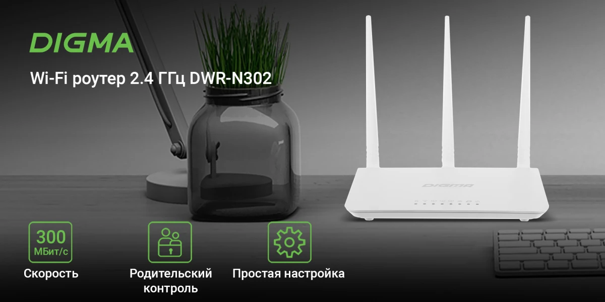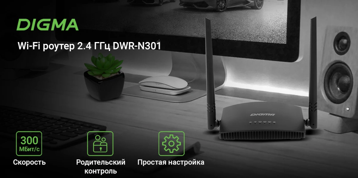 Однодиапазонные роутеры Digma DWR-N301 и Digma DWR-N302 обеспечивают сигнал стандарта Wi-Fi4 на частоте 2,4 ГГц. Они имеют различное количество антенн для улучшения покрытия сети. Обе модели имеют быструю настройку и предоставляют скорость беспроводного соединения до 300 Мбит/с.