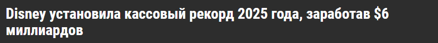 Компания Disney стала единственной студией в 2025 году, чьи мировые кассовые сборы преодолели отметку в $6 миллиардов . Из этой суммы $2,3 миллиарда пришлось на внутренний рынок США, а $3,65 миллиарда - на международные прокаты.