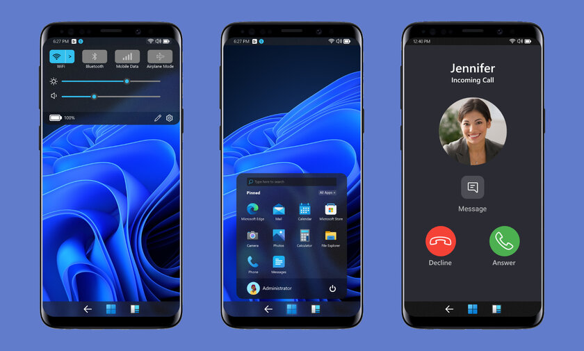 Навигационные кнопки, меню быстрых настроек и панель управления перенесены из Windows 11 практически без изменений, как и меню приложений — «Пуск» на смартфоне смотрится минималистично и необычно из-за своего размера (парящее окошко, занимающее меньше половины экрана). А вот клавиатура явно перенесена из Windows 10 Mobile — точно такой же дизайн (энтузиаст не учёл разве что виртуальный трекпоинт, в концепте его нет).