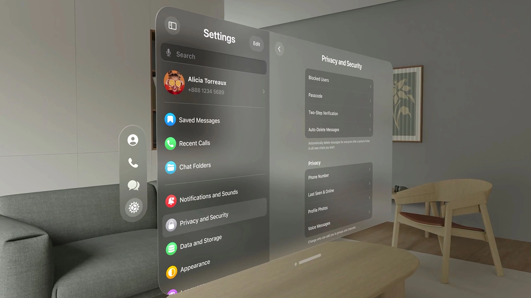 Дуров опубликовал видео интерфейса с надписью «Telegram для VisionOS». Шлем дополненной реальности сделал приложение полупрозрачным, напоминающим компьютерную версию Telegram, основное отличие — отдельная панель слева от основного экрана, с помощью которой можно перейти в настройки, звонки, контакты и сообщения.