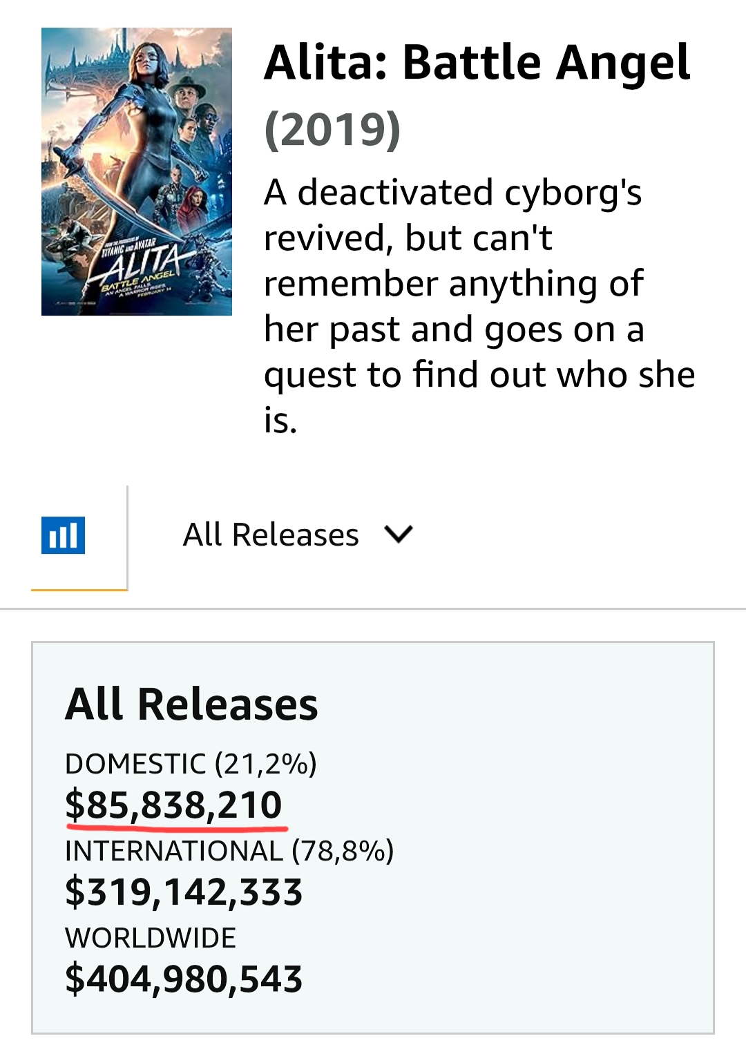 Фильм Фильм «Алита: Боевой ангел» производства 20th Century Studios заработала в мировом прокате 405 миллионов долларов, став самым кассовым фильмом в его фильмографии.