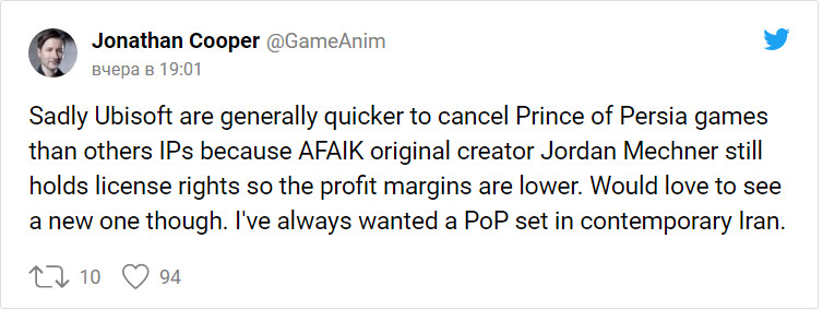 «Жаль, что Ubisoft быстрее отменяет игры по Prince of Persia, чем по другим IP, так как, насколько мне известно, создатель оригинальной игры Джордан Мекнер по-прежнему владеет правами на франшизу, и из-за этого прибыль студии будет меньше. А я бы хотел увидеть новую игру серии. Всегда было любопытно увидеть Prince of Persia, действие которой происходит в современном Иране.» — Джонатан Купер.