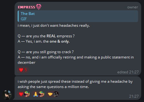 Да, я - настоящая EMPRESS. Я официально ухожу и сделаю публичное заявление в декабре.