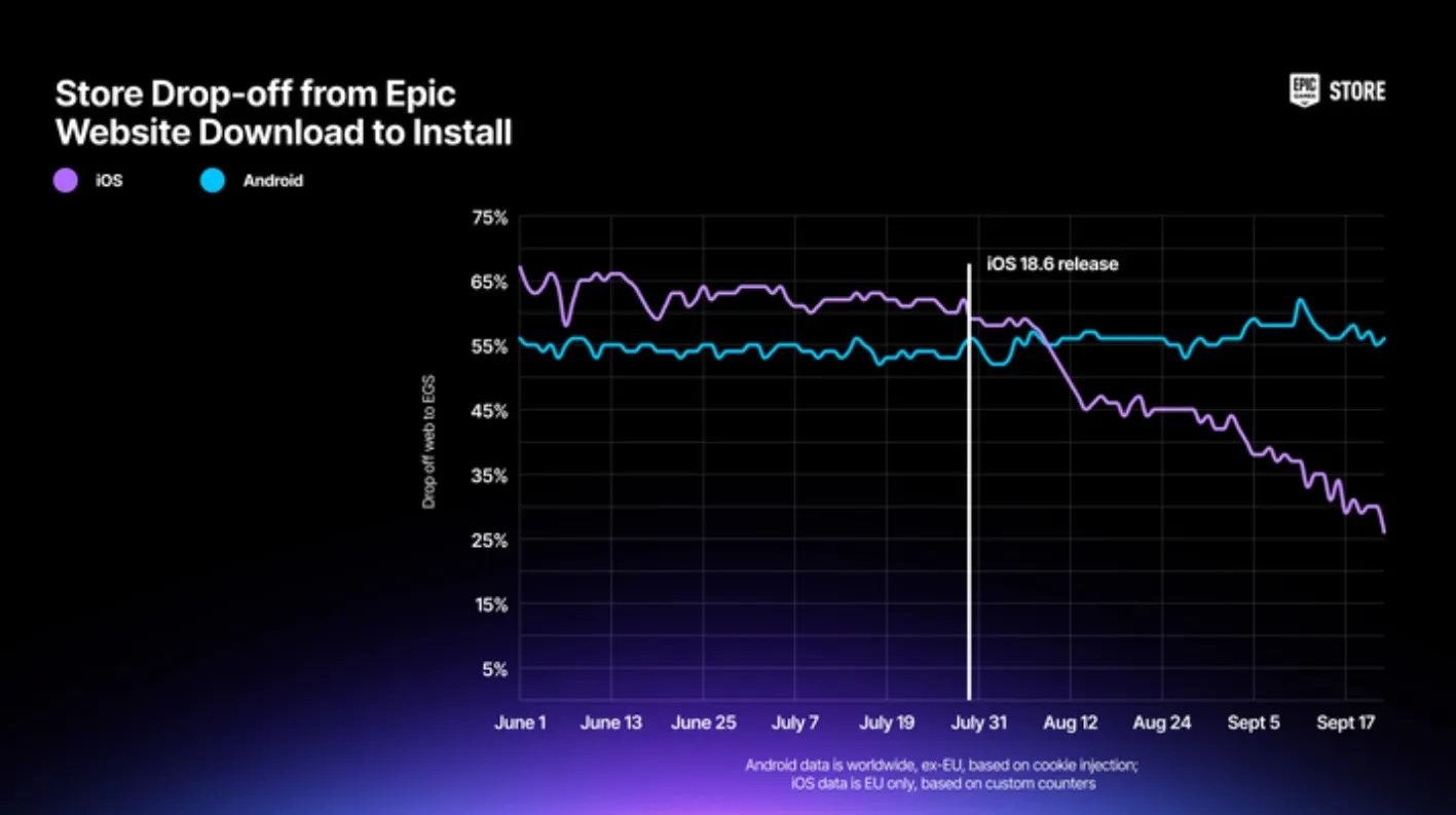 Компания Epic Games поделилась статистикой, согласно которой количество успешных установок магазина Epic Games Store на устройствах с iOS значительно возросло. Это произошло после того, как Apple упростила процесс установки сторонних магазинов приложений в обновлении iOS 18.6, последовав требованиям европейского закона о цифровых рынках (DMA).