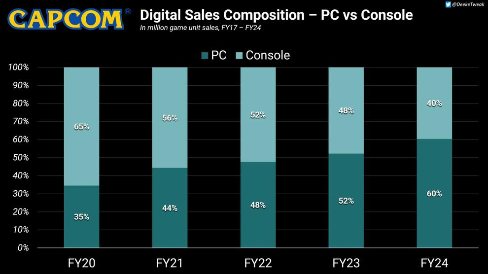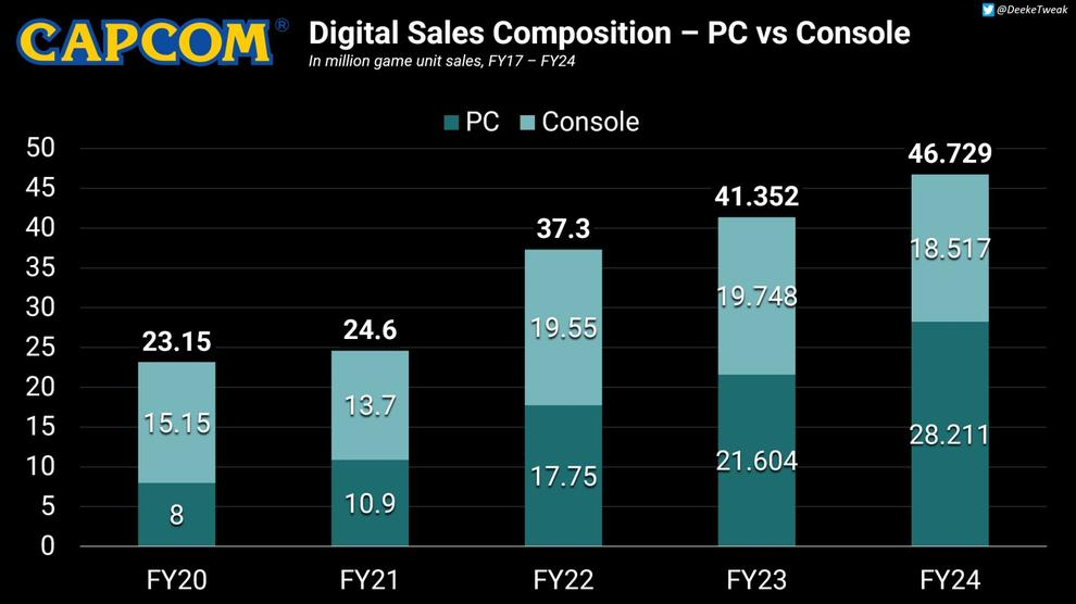 Компания Capcom поделилась финансовым отчётом за прошедший год и отметила ключевое изменение в структуре продаж: PC стал основной цифровой площадкой для реализации игр. Из общего объёма в 51 миллион проданных копий, 28,2 миллиона пришлись на PC, что составляет около 60% всей цифровой выручки. Консоли обеспечили оставшиеся 40% — 18,5 миллионов копий.