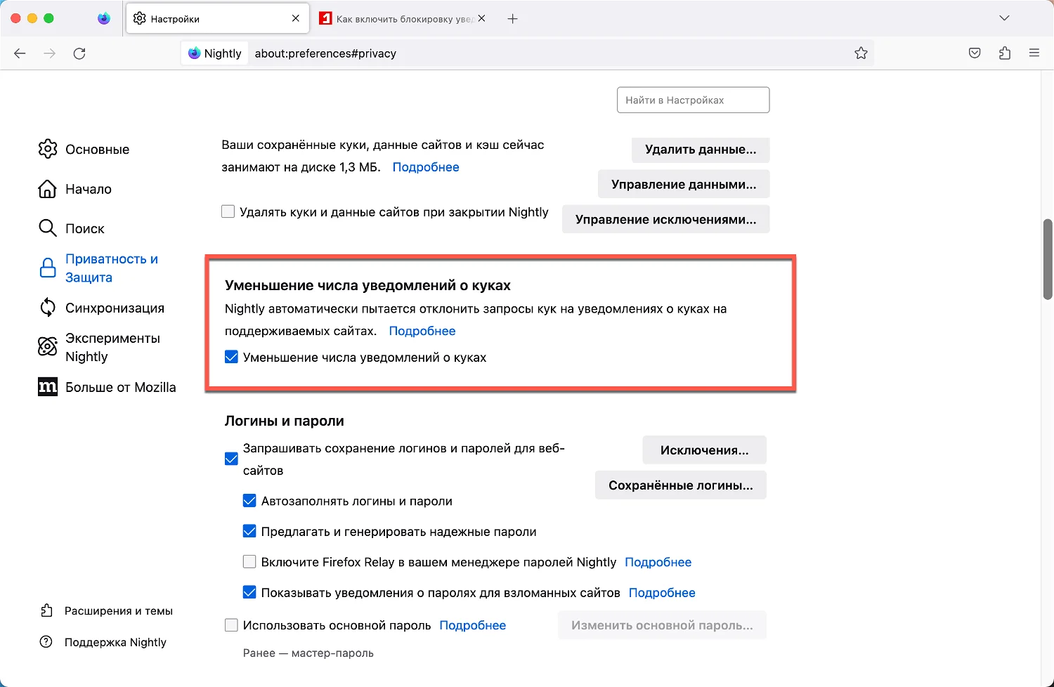 - Установите флажок "Уменьшение числа уведомлений о куках", чтобы включить функцию.
