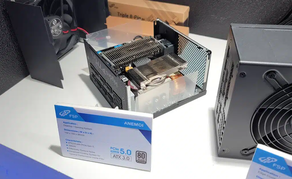 Ещё один интересный экспонат FSP – блок питания новой серии Anemoi. Здесь интересны компактные габариты в сочетании с большой мощностью. Так длина всего 150 мм, а мощность до киловатта. Во-вторых, радиаторами системы охлаждения. В нём сочетаются классические бруски алюминия с нормальными пластинчатыми радиаторами на тепловых трубках.