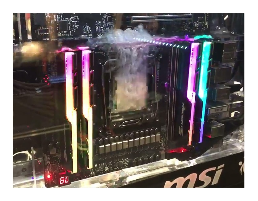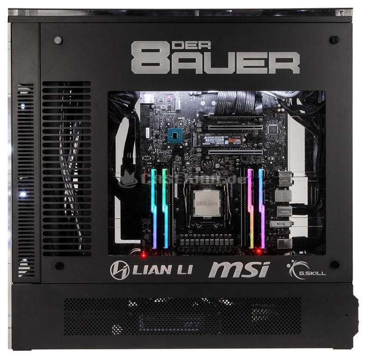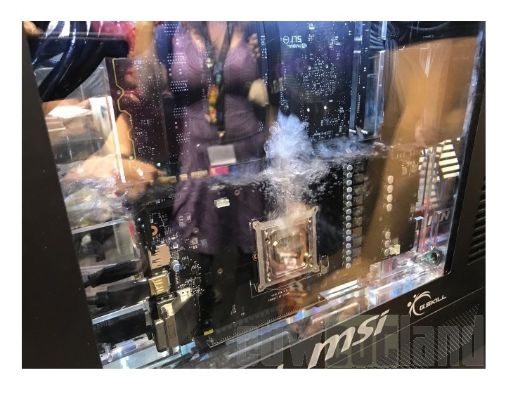 Компьютер собран в Mid-Tower корпусе Lian Li PC-O12WX с герметичным системным отсеком, частично заполненном жидкостью 3M Novec, и прозрачными панелями из закалённого стекла. Спереди закреплены два вентилятора с подсветкой. Поддон для материнской платы выполнен в виде тонкой рамки, он разделяет корпус на две секции. В одной из них находится подключённая посредством PCI-E райзера видеокарта MSI GeForce GTX 1080 Gaming X+ 8G с «полуводоблоком» (водоблок без крышки), в другой — матплата MSI X299 Gaming M7 ACK с шестиядерным процессором Intel Core i7-7800X, 32-гигабайтным (4 × 8 Гбайт) комплектом оперативной памяти G.Skill Trident Z RGB DDR4-3600 и M.2-накопителем Samsung 960 EVO объёмом 250 Гбайт. Цепи питания гнезда LGA2066 и чипсет не накрыты штатными радиаторами: область VRM погружена в жидкость, а набор системной логики потребляет всего 6 Вт и может эксплуатироваться без теплосъёмника.