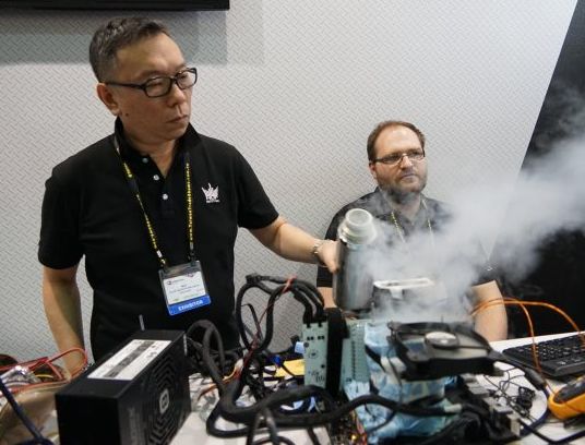 Надо сказать, что представителей GALAX за язык никто не тянул, и словам в наше неспокойное время уже никто не верит. Любые намерения нужно подтверждать действиями. Доказательства не заставили себя долго ждать, как поясняют коллеги с сайта Nordic Hardware. На стенде GALAX своё мастерство демонстрировал "специально приглашённый" Mad Tse - оверклокер с достаточным стажем, чтобы заняться долгожданным разгоном GeForce GTX 1080 с применением жидкого азота.