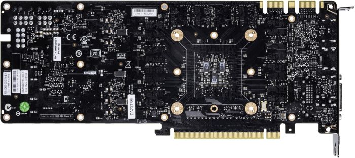 Оборотная сторона печатной платы у GeForce GTX 980 Ti эталонного дизайна ничем не прикрыта. Однако, укрепляющие пластины с радостью предложат партнёры NVIDIA - тем более, что они подготовили приличный ассортимент альтернативных версий GeForce GTX 980 Ti, о которых мы расскажем отдельно. Привлекает внимание посадочное место для третьего разъёма питания "продольной" ориентации - очевидно, как и в случае с GeForce GTX Titan X, такая компоновка будет использоваться профессиональными графическими адаптерами. Игровая видеокарта GeForce GTX 980 Ti имеет только два разъёма питания "6 + 8 контактов", которые выходят на боковую панель.