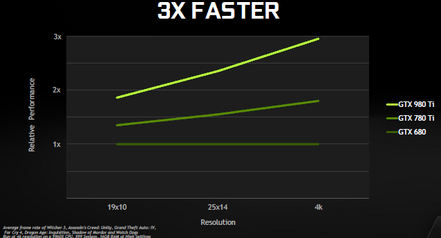 В отсутствие официально представленных конкурентов нового поколения, NVIDIA сравнивает быстродействие GeForce GTX 980 Ti с показателями своих продуктов.