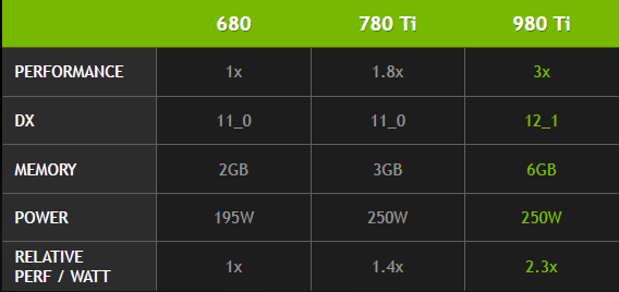 GeForce GTX 980 Ti поддерживает DirectX 12. Добрая часть презентации также посвящена инструментарию для разработчиков игр с технологиями виртуальной реальности GameWorks VR, а также новым возможностям DirectX 12 и G-SYNC. Об уровне энергопотребления GeForce GTX 980 Ti мы узнаём почти случайно из таблицы со сравнительными характеристиками. Для работы с видеокартой этой модели NVIDIA рекомендует использовать блок питания мощностью не менее 600 Вт.