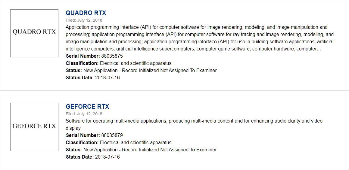 До долгожданного выхода нового поколения видеокарт Nvidia осталось совсем немного, но какой-то конкретики насчёт их названий ещё нет, предполагается, что новые видеокарты получат названия вида: GTX1180/GTX2080, но недавно Nvidia подала заявки на торговые марки Quadro RTX и GeForce RTX.