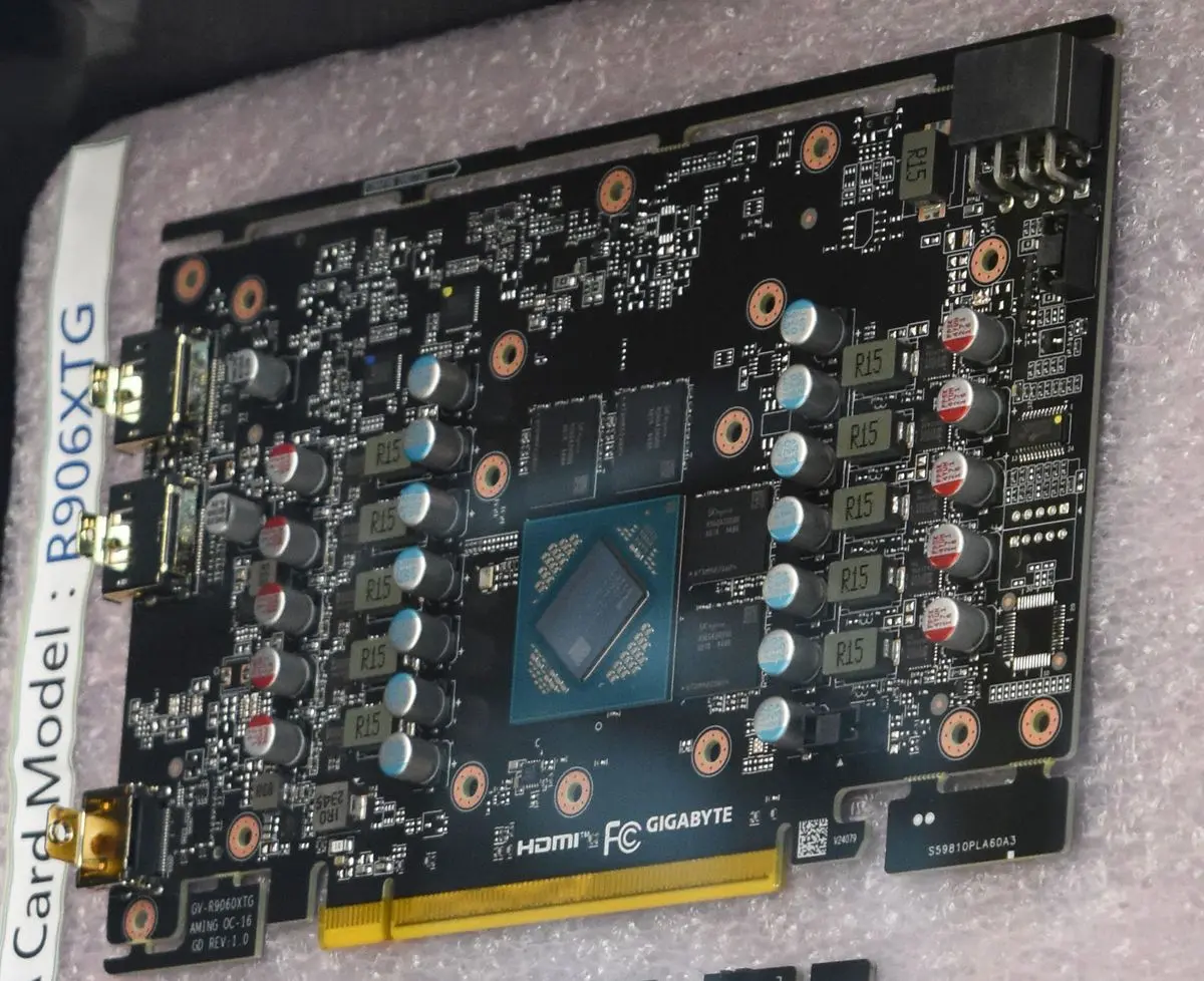 Изображение, помеченное внутренним кодом «R906XTG», изображает плату, предназначенную для одной из двухслотовых, трехвентиляторных карт RX 9060 XT Gaming от Gigabyte. Согласно презентации AMD на Computex, Radeon RX 9060 XT использует кристалл графического процессора Navi 44; изображение печатной платы подтверждает его размещение в центре платы.