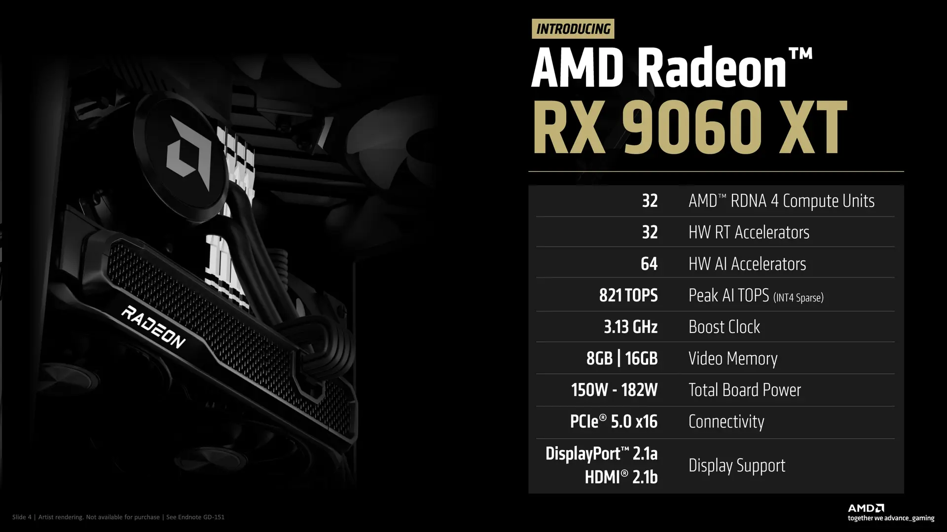 Текущее руководство по рекомендованной розничной цене от AMD указывает 8 ГБ RX 9060 XT по цене 299 долларов США и 16 ГБ вариант по цене 349 долларов США, доступность запланирована на 5 июня 2025 года. Варианты вывода изображения, по-видимому, ограничены тремя портами, вероятно, включающими два разъема DisplayPort и один порт HDMI — расположение, соответствующее референсу AMD.