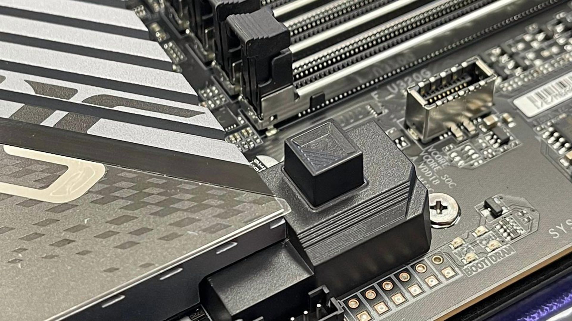Здесь можно видеть кнопку, напоминающую ASUS PCIe Slot Q-Release, то есть позволяющую удобно извлекать видеокарту. Вместо того, чтобы подбираться к лапке, блокирующей видеокарту в слоте, достаточно нажать кнопку.