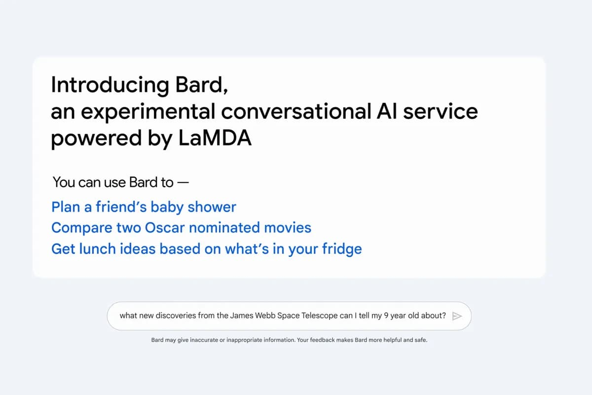 "Bard может служить местом для творчества и начальной платформой для ученых исследований, помогая вам объяснить 9-летнему ребенку последние открытия делаемые телескопом Джеймса Уэбба или узнать больше о лучших нападающих в футболе на текущий момент и получить упражнения для улучшения ваших навыков", – говорит Сундар Пичаи.