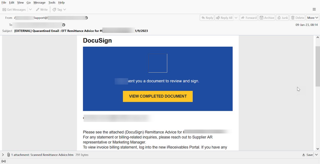 Хакеры отправляют жертвам мошеннический документ, связанный с сервисом управления электронными документами DocuSign. В письме говорится, что нужно просмотреть и подписать документ. По ссылке пользователь переходит на настоящую страницу DocuSign. Однако основную роль в атаке играет HTM-вложение, отправленное вместе со ссылкой DocuSign. В нём содержится SVG-изображение, закодированное с использованием Base64. Хотя оно пустое, этот файл имеет встроенный JavaScript-код, перенаправляющий на вредоносный URL-адрес.