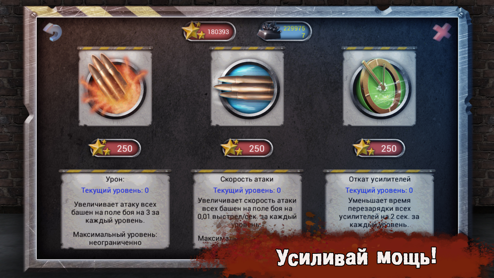 - Исследования боевых навыков и уникальных башен для защиты бункера.