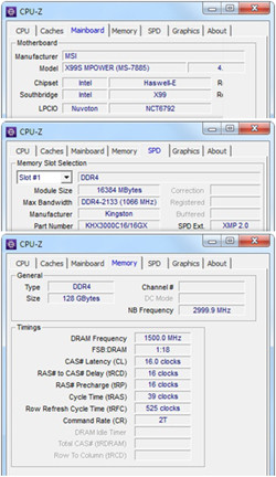 Чтобы подтвердить успешную работу 128-ГБ набора оперативной памяти серии HyperX Predator на частоте DDR4-3000 МГц, специалисты компании Kingston воспользовались материнской платой MSI X99 MPOWER и процессором Intel Core i7-5820K, предоставив в качестве доказательства скриншоты утилиты CPU-Z.