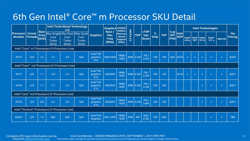 В семейство мобильных процессоров Skylake вошли чипы серии Core m — Core m3, Core m5 и Core m7. Все они имеют два вычислительных ядра с возможностью одновременной обработки до четырёх потоков инструкций. В состав процессоров входит графический контроллер Intel HD Graphics 515. Номинальная тактовая частота варьируется от 0,9 до 1,2 ГГц, частота в турбо-режиме — от 2,0 до 3,1 ГГц. Максимальное значение рассеиваемой тепловой энергии (TDP) равно всего 4,5 Вт.