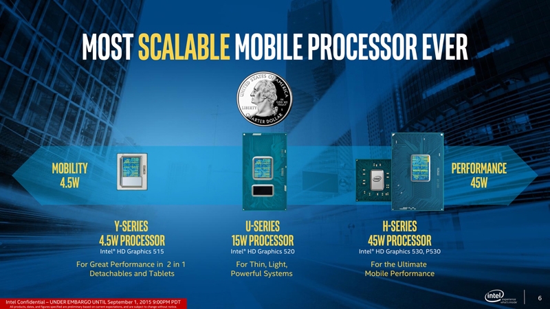 Все представленные изделия производятся по 14-нанометровой технологии. Intel называет новые процессоры своими самыми передовыми и энергетически эффективными решениями семейства Core. Утверждается, что по сравнению с чипами предыдущего поколения изделия Skylake обеспечат прирост производительности графической подсистемы до 40 %. Выигрыш в быстродействии может достигать 60 %.
