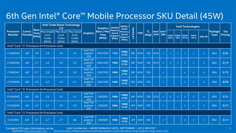 Кроме того, представлены мобильные чипы Skylake с показателем TDP в 15, 28 и 45 Вт. Такие процессоры имеют 2 или 4 вычислительных ядра. Большинство моделей поддерживает технологию многопоточности HyperThreading. Практически во всех чипах реализована функция динамического увеличения тактовой частоты. Процессоры вошли в серии Core i3, Core i5, Core i7 и Pentium. В зависимости от модели задействована интегрированная графика Intel HD Graphics или Intel Iris Graphics.