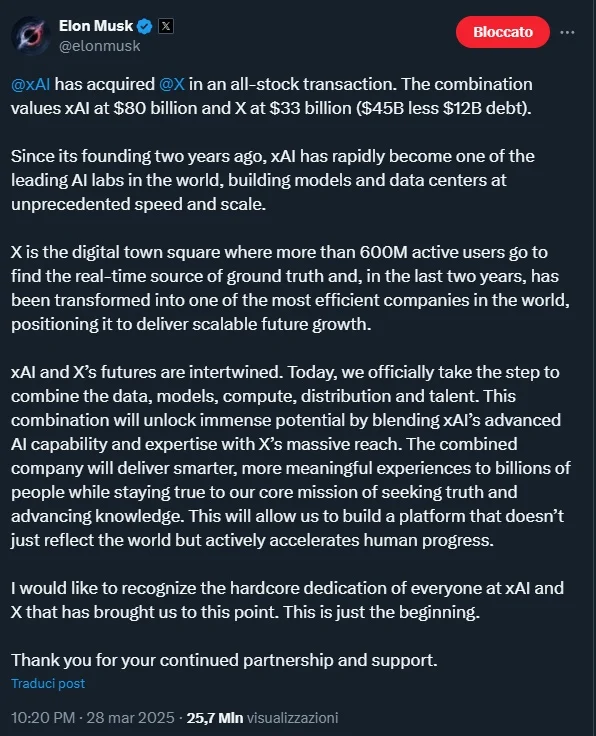 Илон Маск объявил о продаже принадлежащей ему социальной сети X стартапу xAI, который занимается разработками в области искусственного интеллекта.