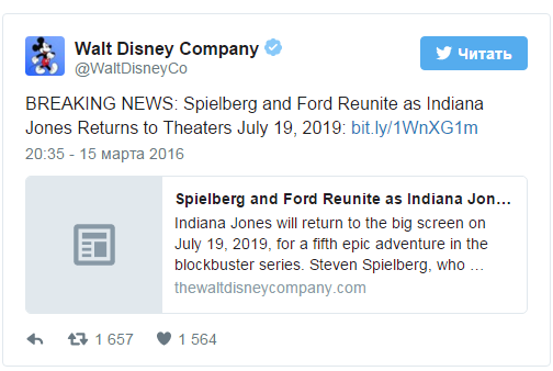 Официально: в twitter компания Дисней объявила о выходе фильма: Индиана Джонс 5, дата выхода 19 июля 2019 год. Самое отличное то, что Харрисон Форд вернется, и будет все также исполнять роль многими любимого, нашего героя. Есть также печальная новость - режиссер не Стивен Спилберг.