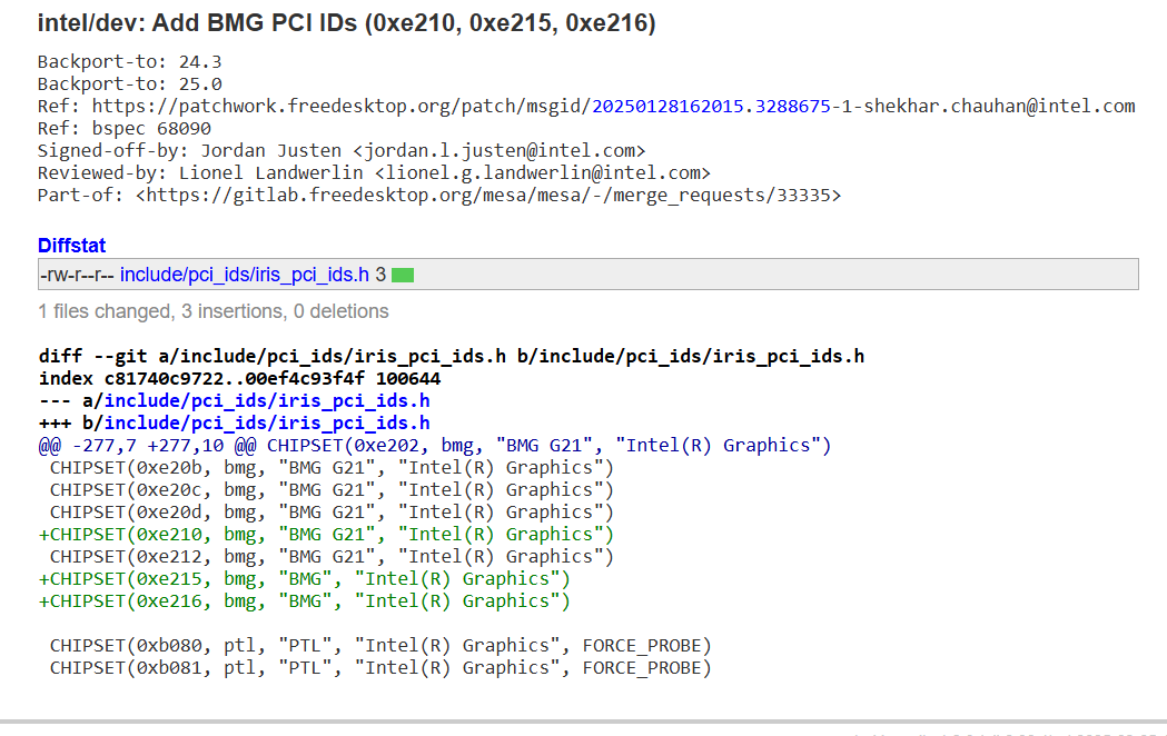 В коде Mesa 3D появились записи с номерами 0xe210, 0xe215 и 0xe216. Они относятся к продуктам на архитектуре Xe2 и дополняют уже известные идентификаторы для чипа BMG G21. Это может указывать на скорый анонс новых моделей в семействе Battlemage.