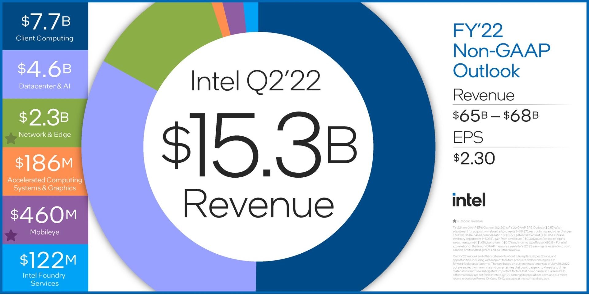 Оборот упал до $15,3 млрд., то есть на 17% по сравнению с Q2 2021 и на 22% по сравнению с предыдущим кварталом. Снижение коснулось почти всех продуктов. Самое прибыльное подразделение Client Computing Group (CCG) снизило продажи на 25% до $7,7 млрд. Здесь сказалось падение рынка ПК за последние месяцы, а также не самые радужные прогнозы на будущее.