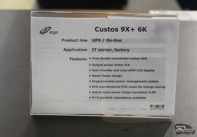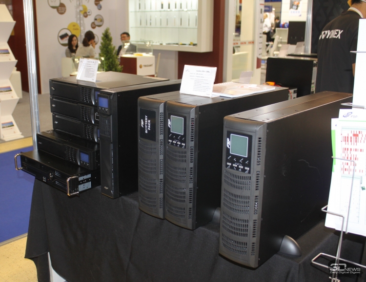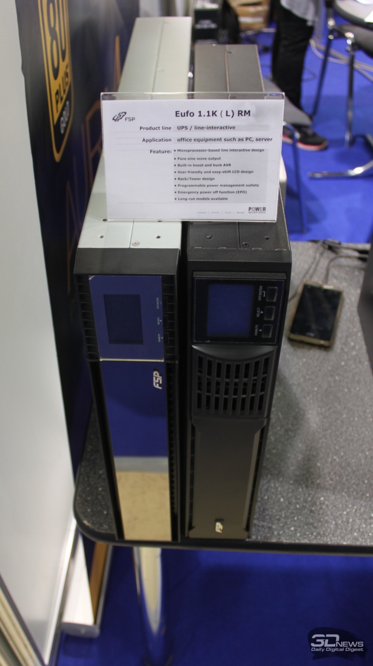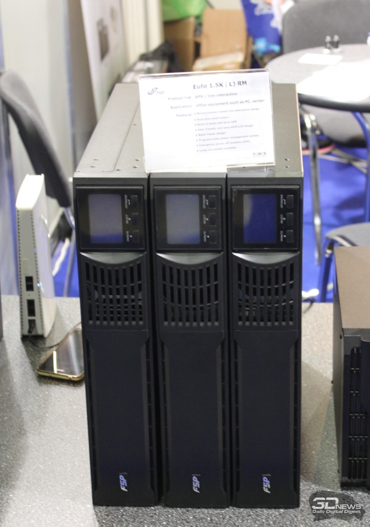 Упор в экспозиции был сделан на источники бесперебойного питания с двойным преобразованием, обеспечивающих синусоиду на выходе, но на стендах были представлены и другие конфигурации с такой же формой сигнала. Например, недорогие ИБП серии Eufo, рассчитанные на домашних и корпоративных пользователей, выполнены по линейно-интерактивной схеме. Они предназначены для обеспечения бесперебойной работы мощных персональных компьютеров и графических станций, периферии и маломощного телекоммуникационного оборудования (маршрутизаторы, модемы и т.п.). Семейство Eufo включает в себя пять моделей мощностью от 360 до 1400 Вт, выполненных в двух форм-факторах — традиционном для установки вертикально и в виде блока для монтажа в серверную стойку.