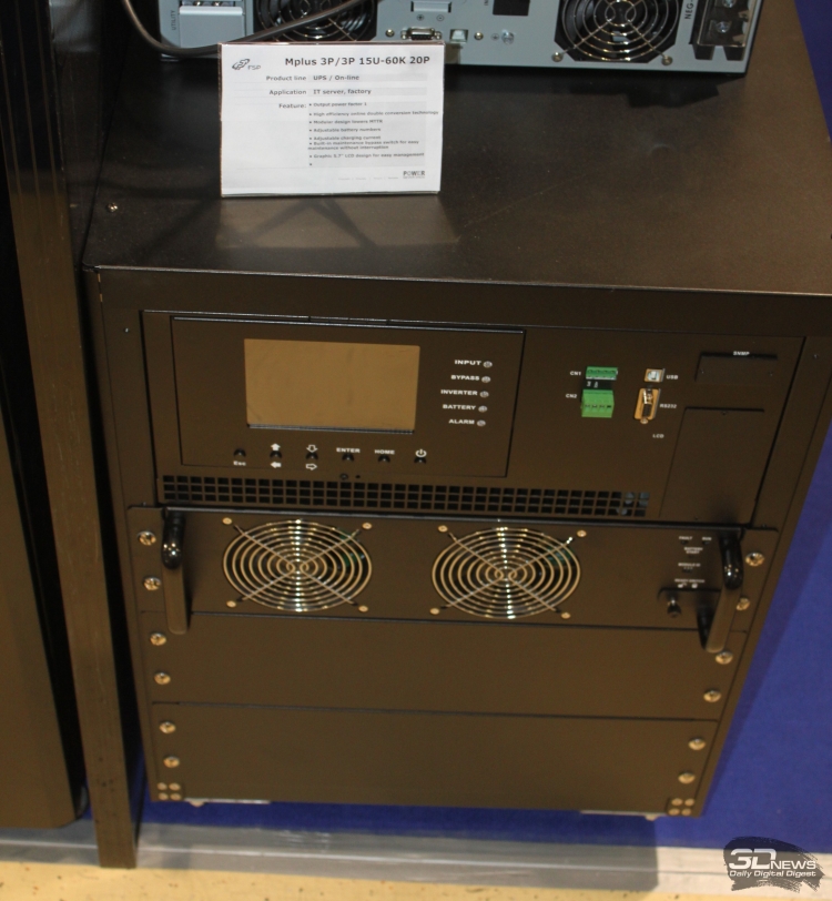 Модельный ряд модульных трёхфазных ИБП с двойным преобразованием серии Mplus — это гибкое, масштабируемое решение, способное обеспечить защиту и бесперебойную работу сети предприятия в диапазоне 20–210 кВт. Одна из показанных на выставке моделей представляет собой небольшой шкаф, рассчитанный на установку трёх модулей мощностью по 20 кВт каждый.