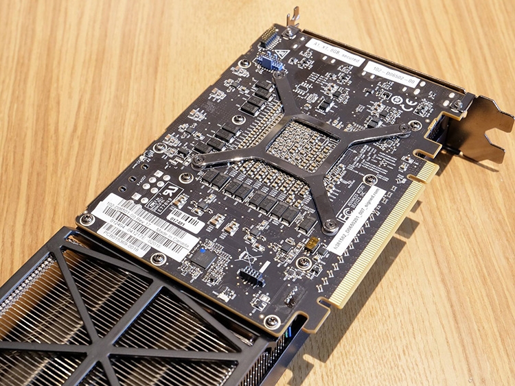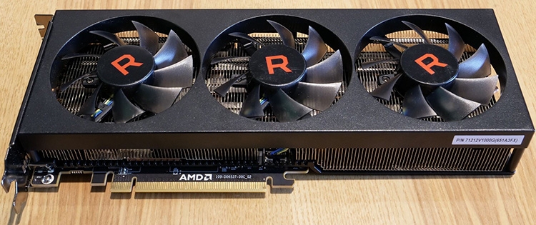 Рассматриваемый образец Radeon RX Vega 56 необычен сочетанием компактной, длиной около 15 см, печатной платы и массивного кулера, занимающего до 30 см в длину и два слота расширения в высоту. Рядом с логотипом AMD на текстолите выгравирован ранее не встречавшийся идентификатор PCB — 109-D06537-00C_02.
