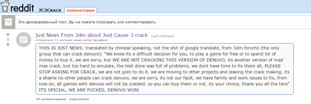 Ну и войдут в историю, как люди, взломавшие Denuvo. А 3DM слились после выхода Just Cause 3.
