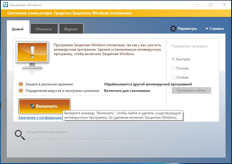 Но это только начало. Если у пользователя все же стоит совместимый антивирус, то Windows 10 предупреждает, что у системы отключен «защитник Windows» и предлагает его включить. И конечно же включение «защитника» приводит к удалению другого антивируса.