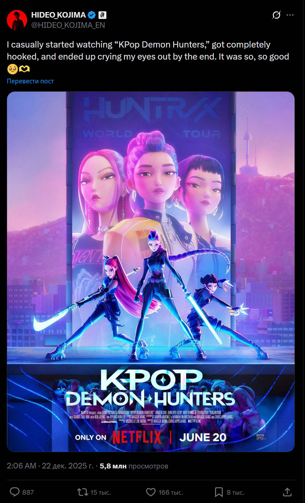 Знаменитый геймдизайнер Хидэо Кодзима, известный своей любовью к кинематографу, поделился эмоциональным отзывом на один из главных анимационных релизов уходящего года. Создатель Death Stranding признался, что музыкальный боевик «Кейпоп-охотницы на демонов» буквально довел его до слез.