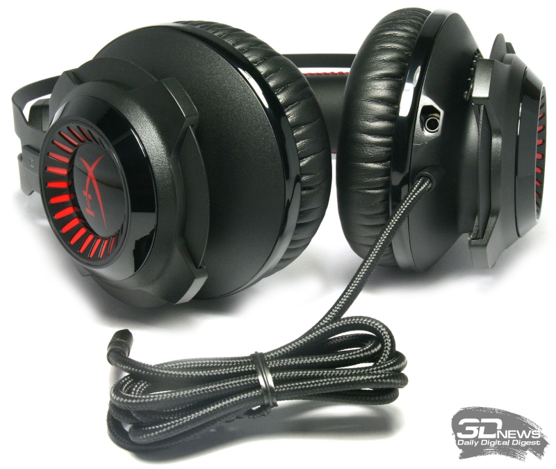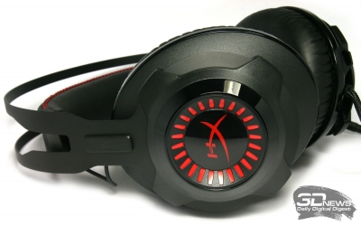 Дизайн больших овальных чашек под стать оголовью. Чёрный матовый пластик их корпусов снаружи закрыт круглой декоративной накладкой с красными элементами. Сами чашки крепятся к держателям шаровыми шарнирами, позволяющими им свободно отклоняться в любом направлении от вертикальной оси на угол порядка десяти градусов. Этого вполне достаточно для тонкой подстройки под любого пользователя. Чашки объединены между собой тонким кабелем в прочной синтетической оплётке, аккуратно проложенным внутри оголовья.