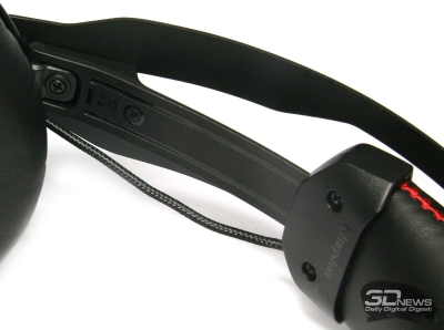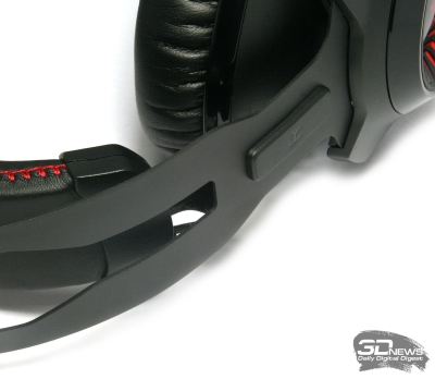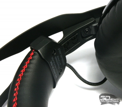 Из металла выполнен основной каркас гарнитуры, который представляет собой верхние дуги оголовья, переходящие в кольца держателей чашек. Часть оголовья, прилегающая к голове, имеет подпружиненный автоматический раздвижной механизм, основу которого составляют пластиковые ленты. Оголовье, как и амбушюры, заполнено мягким материалом с памятью формы, а снаружи обшито приятной на ощупь очень мягкой искусственной кожей. Ну и завершает композицию ярко-красная толстая нить, которая крупными стежками соединяет части обшивки.