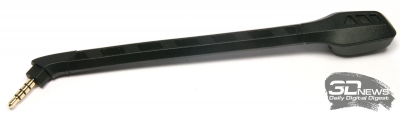 Расположенный на одном конце дополнительного кабеля пульт управления имеет простую, но изящную конструкцию. Он выглядит как небольшой параллелепипед с прищепкой для крепления к одежде, с одного торца которого закреплён кабель, а с другого расположен разъём для подключения гарнитуры. Основную часть его лицевой поверхности занимает сдвижная кнопка отключения микрофона, ну а на одной из боковых граней размещено колёсико регулировки уровня громкости.