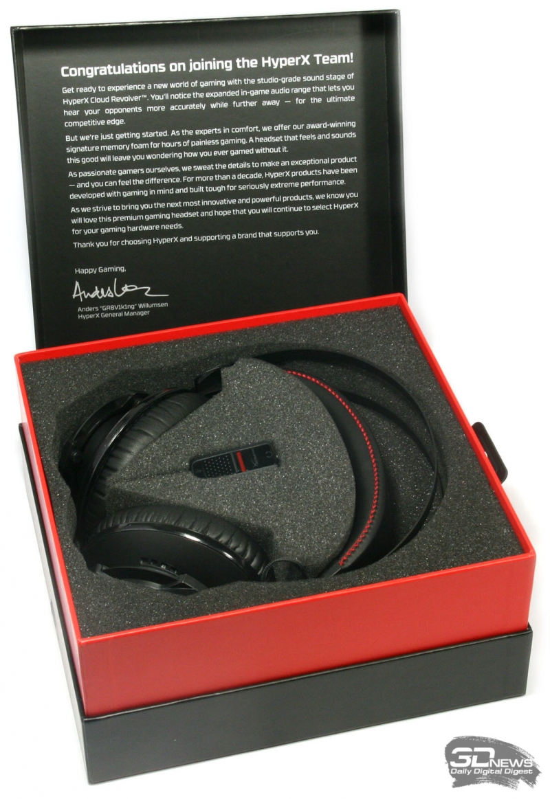 Гарнитура поставляется в большой коробке из очень плотного картона с суперобложкой, выполненной в традиционных для бренда HyperX чёрно-красных цветах. Вряд ли найдётся много пользователей, которые смогут легко расстаться с коробкой, отправив её в мусорное ведро, ведь в ней можно и хранить, и перевозить гарнитуру, не опасаясь даже самых серьёзных внешних воздействий. Как и в случае с моделью Kingston HyperX Cloud II, на внутренней стороне крышки новинки напечатано приветствие от руководства компании.