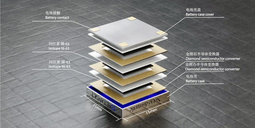 Кристаллическая структура вырабатывает электричество за счёт энергии, выделяемой распадающимся изотопом Никель-63 в виде пластинок толщиной 2 микрометра. По текущим данным испытаний, коэффициент преобразования энергии батареи достигает 8,8%. Использование радиоактивных источников никеля-63 более высокой чистоты позволит дополнительно улучшить плотность и мощность батарей.
