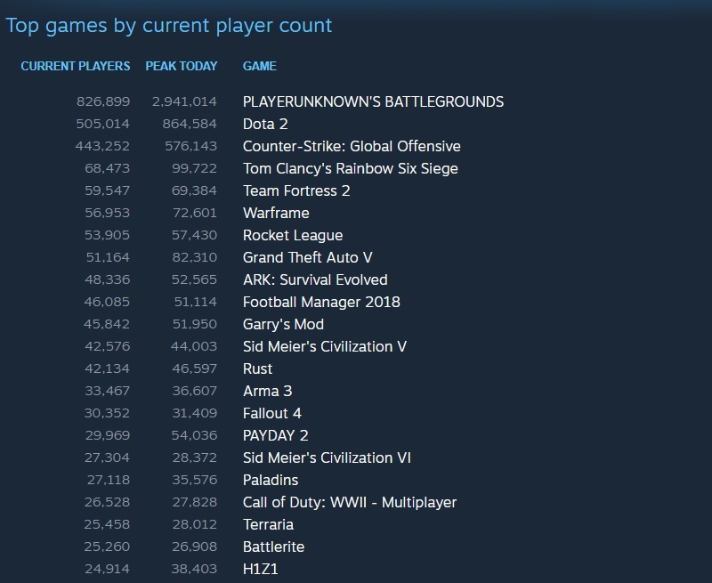 Что касается самых популярных игр, то тут не произошло особых изменений за последние месяцы. Первое место уверенно держит PlayersUnknown: Battlegrounds с пиковым онлайном почти 3 млн игроков. Далее идет Dota 2 с 860 тыс. одновременных пользователей. Отметим некий спад популярности этой игры, ведь еще несколько месяцев назад среднее количество игроков Dota 2 в час-пик превышало один миллион, а максимальное значение достигало 1,3 млн человек онлайн.