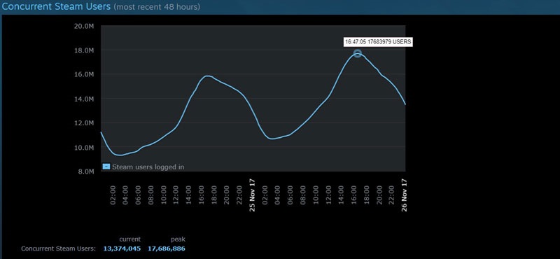 Вчера в сервисе Steam был установлен новый рекорд по количеству одновременно находящихся в системе пользователей — 17 683 979 человек. В сентябре был покорен 15-миллионный рубеж, а в прошлом месяце эта цифра превысила 16 миллионов. Более того, есть все основания полагать, что Steam уже в этом году покорит отметку в 18 миллионов геймеров онлайн.