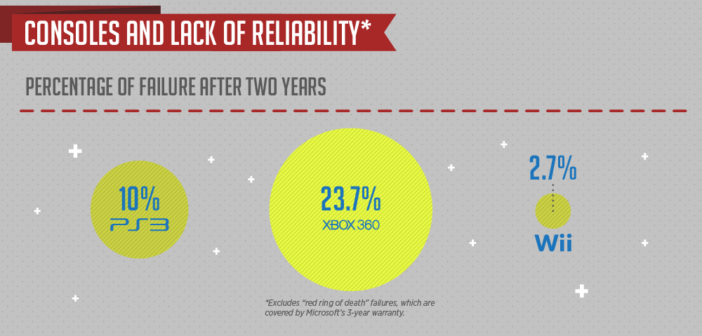 Компьютеры вполне заслуженно критикуются за отсутствие надёжности системы, которая выражается в программных сбоях и поломках оборудования. Однако, по данным рынка США, консоли в этом отношении также не могут порадовать своих владельцев, разве что маломощная Wii, процент поломок которых после истечения двухлетнего срока использования составляет лишь 2,7%. PS3 при этом имеет показатель поломок в 10%, а степень ненадёжности Xbox 360 составляет значительные 23,7% (причём в эту цифру не входят так называемые сбои «красное кольцо смерти», которые Microsoft бесплатно устраняет в течение 3 лет).