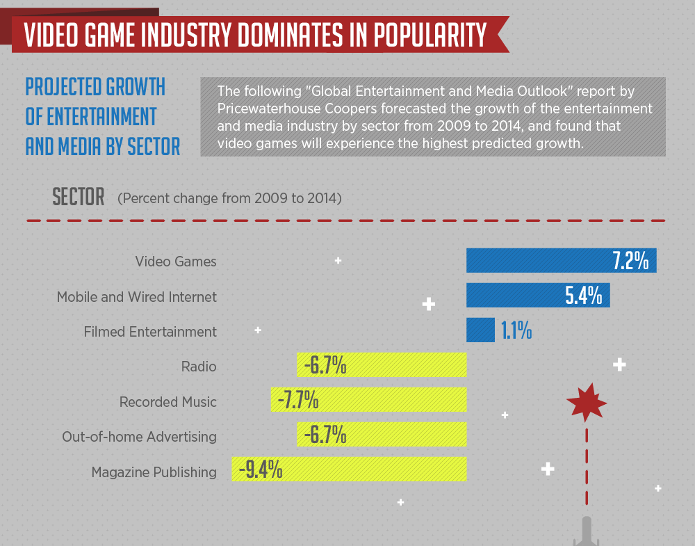 Исследование Pricewaterhouse Coopers показывает, что в развлекательной сфере наибольшее развитие в ближайшие годы получит индустрия видеоигр, ежегодный рост которой с учётом сложных процентов составит 7,2% с 2009 по 2014 годы.