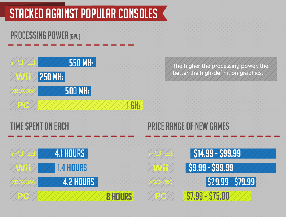 Недавно запущенный сайт igniteGT, посвящённый гоночным симуляторам, опубликовал созданную им инфографику, отражающую состояние игрового рынка в разрезе противостояния компьютеров и консолей. Данное графическое обобщение известных на сегодня данных представляет довольно интересный аналитический материал, позволяющий понять, что рынок компьютерных игр не только не угасает, но даже более жизнеспособен, чем индустрия домашних консолей.