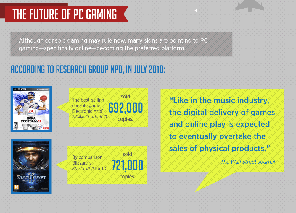 Данные исследований NPD Group состояния рынка видеоигр показывают, что компьютеры возвращают корону лидерства. Например, самая популярная на консолях игра EA NCAA Football'11 была продана в июле 2010 года в количестве 692 тыс. копий, тогда как StarCraft для ПК разошёлся в 721 тыс. экземплярах. Wall Street Journal считает, что вслед за музыкальной индустрией цифровая дистрибуция и онлайн-игры превзойдут продажи на физических носителях.