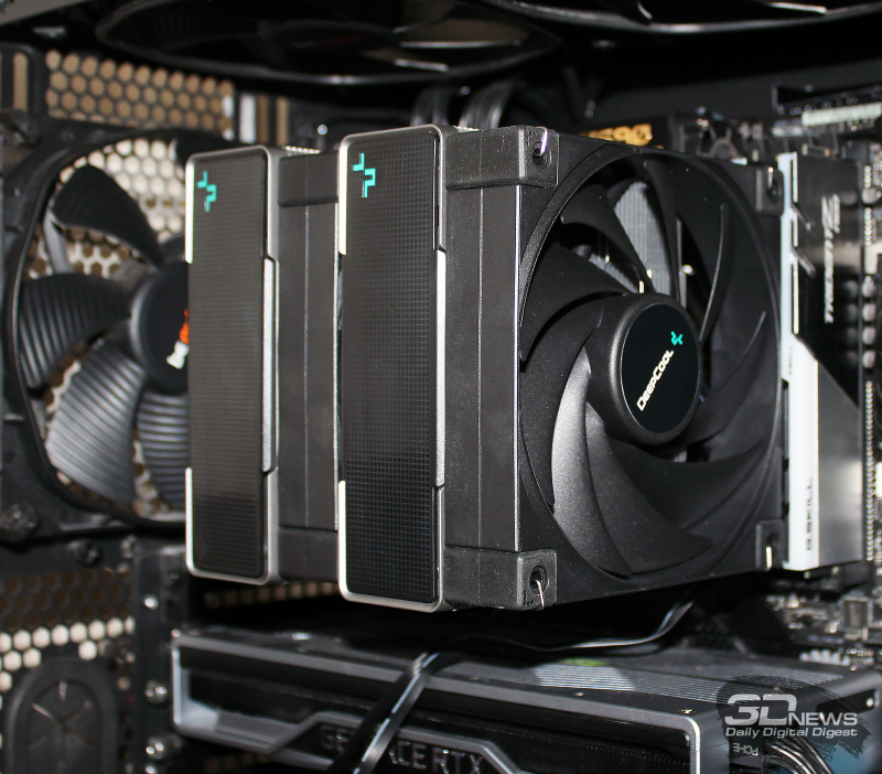 Штатно радиатор продувается одним 120-мм пропеллером на базе гидродинамического подшипника. Он вращается со скоростью 500-1850 об/мин, прокачивает до 117 кубов воздуха в час и издаёт не более 31,5 дБА шума. Вентилятор можно переключить в режим LSP, что снижает потолок оборотов до 1550, производительность до 89 кубов и шум до 25,9 дБА.