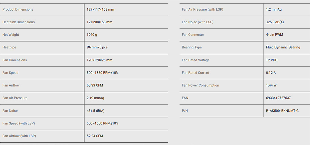 AK500 имеет габариты 127 х 90 х 158 мм (Ш х Г х В) и массу 1040 грамм вместе с вентилятором. В основании медная теплораспределительная пластина, покрытая слоем никеля. Также никелированы тепловые трубки.